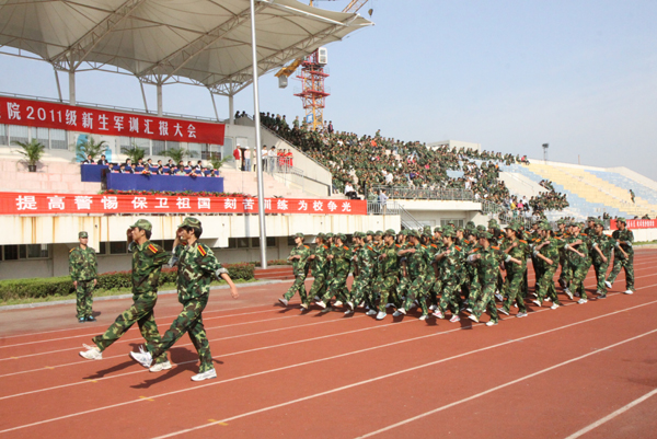 9月23日上午,我校在西校区体育场举行2011级新生军训汇报大会。校领导袁洪志、吴光林、季翔、任留钦、张登宏、沈士德,中国人民解放军73101部队教导员孙利舒在主席台就座并观看了军训汇报。