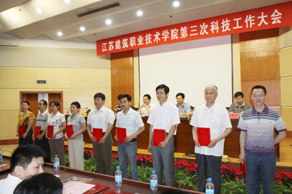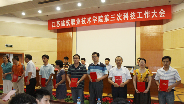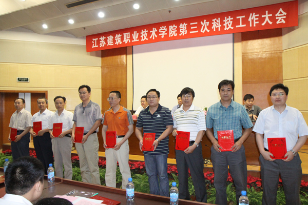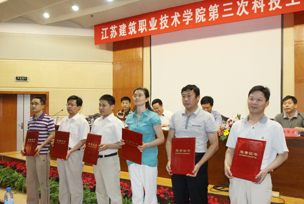 建筑工程学院、建筑设备工程学院等6个二级学院、科研机构被评为先进集体,张宝军、王军强等22名教师被评为先进个人,《装饰型外墙保温系统开发与应用研究》(主持人:季翔)、《钢结构住宅造价研究与应用》(主持人:陶红林)等10个项目荣获优秀科技成果奖,《并联装置中调速水泵台数的确定及运行管理》(作者:刘家春)、《徐州城市色彩规划设计与管理研究》(作者:季翔)等22篇论文荣获优秀科技论文奖。先进集体、先进个人、优秀科技成果代表、优秀论文作者依次上台领奖后,市政工程学院院长王国平、建筑工程学院教师王军强分别代表先进集体和先进个人作大会交流发言。