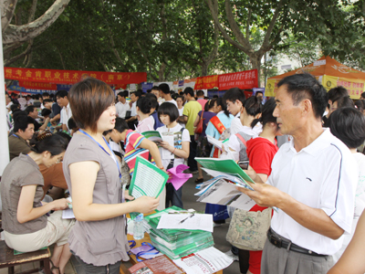 早上8时,考生陆续进场咨询。一位考生说,明天开始填报志愿,今天很迫切地想参加此次活动,相信将对自己有指导作用。校园林荫大道两侧,整齐划一地布置着各所高校的咨询展台。没到上午9时,这里已被如潮的人流所吞没。今天徐州的天气阴湿闷热,但仍然阻挡不了考生和家长的热切心情。就现场咨询反馈的情况来看,考生心理日趋理性,他们不是盲目地选择,而是注重在地域、学校、专业、发展前景多维度的考量后的均衡。有些家长更是有备而来,在所中意学校的咨询台前,把该学校的师资队伍、培养方式、专业前景以及生活保障等方方面面的内容一一仔细询问。学校的品牌效应依然发挥着巨大影响,正如一位考生家长所言,现在高校众多,我们只能依据孩子的考分,尽可能地选择那些名头更大的学校。现场咨询会上也证明了这一点,很多省内外知名的学校咨询台前,被考生和家长围了水泄不通,而另外一些学校相比较为冷清。来自不同学校的老师也给考生提出了相同的建议,无论选择哪所学校,在成绩允许的条件下,进行专业的进一步优选将对考生今后发展起到积极作用。