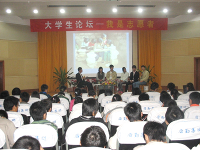 我院04届毕业生、西部计划志愿者张统刚在陕西泾阳服务的两年间,担任了初一、初二十二个班级的微机课老师,业余时间还为当地团省委建设了西部计划网站、共青团泾阳县委原点青年网站,还有县委组织部、计划局的网站等。“我来西部,是来做贡献的,而不是因为我找不到工作。只是因为我觉得‘年轻的时候,我们应该把自己放飞。飞到一个能包住自己蓬勃的心的地方。就像播下种子一样,要给他一块适合他的土壤’”,“一个人做,真的很累。不指望能轰轰烈烈,只希望能尽己所能,无怨无悔”简单而质朴的语言博得在场学生的热烈掌声。服务来徐的四川灾区伤员志愿者周宜婷、陈鑫,关注留守儿童封倩倩和民生问题的韩振华等同学也介绍了自己的志愿服务经历,同学们奉献了爱心,也使自己得到了锻炼。学到了书本和课堂上学不到的知识的同时,他们的专业素质与忘我的精神也获得了大家的肯定。