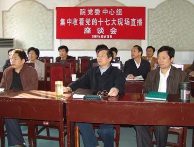 中国共产党第十七次全国代表大会于10月15日9:00在人民大会堂隆重召开。由此,中国共产党的历史掀开新的篇章,中国特色社会主义迈上新的征程,中华民族伟大复兴展现新的前景。院党委理论学习中心组全体成员集中收看了党的十七大开幕式现场直播并进行了热烈的讨论。