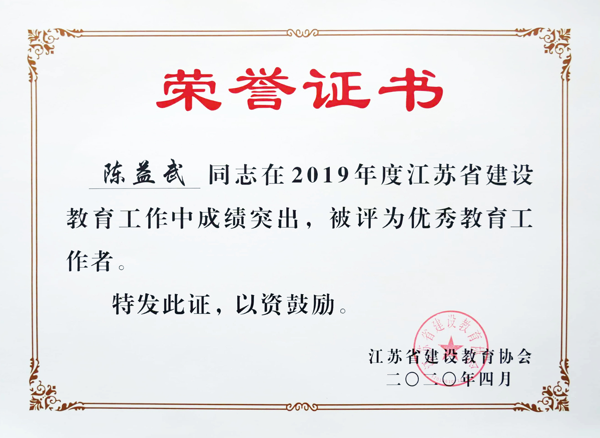4月16日,江苏省建设教育协会传来喜讯,我校荣获2019年度建设教育产教融合工作先进单位、建设教育工作先进单位,陈益武同志荣获优秀教育工作者。