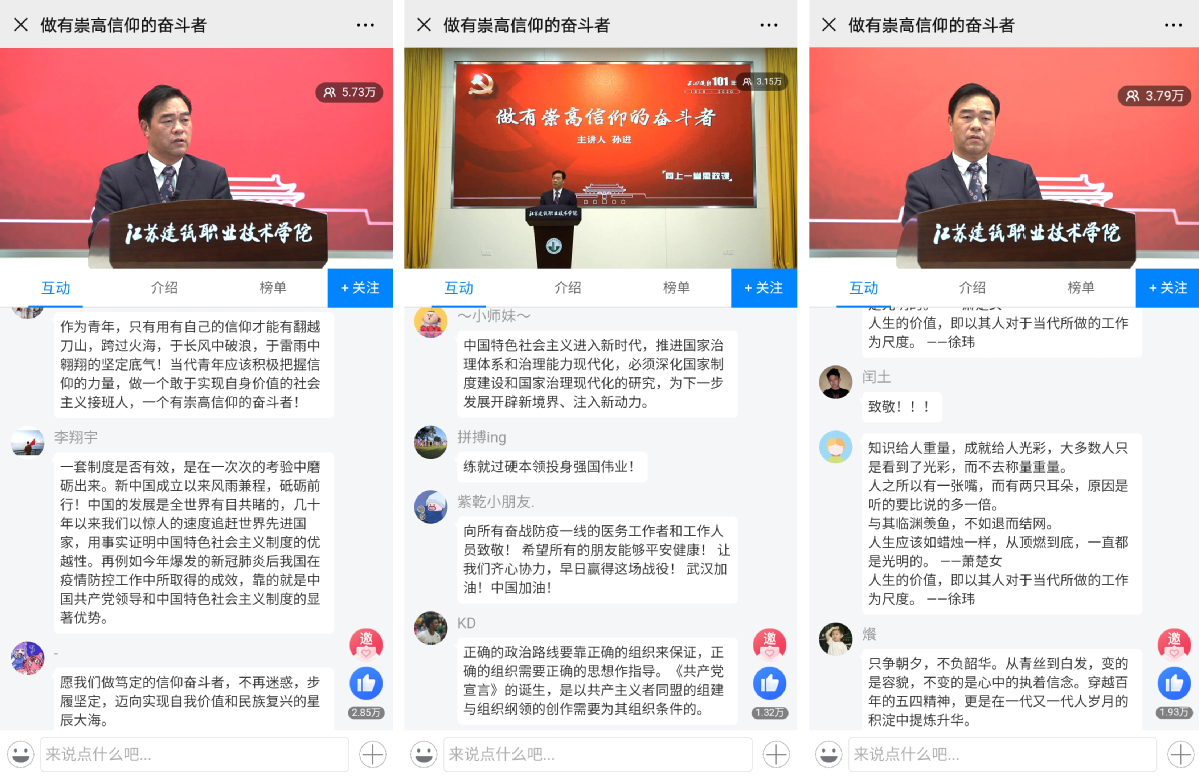 全校9000多名师生通过微赞、抖音直播间,在教室、宿舍同时观看,直播在线人数达5.71万人次。这是马克思主义学院“同上一堂思政课”系列讲座的开篇之作,后续的每周二下午马院教师赵炜、崔宏利、张文远还将陆续就“中国青年为什么行”这个主题给全校学生同上一堂思政课。