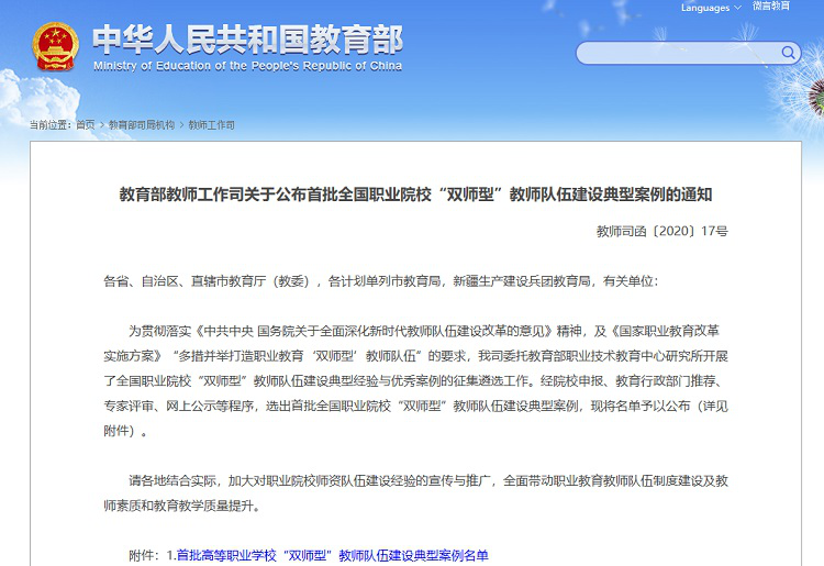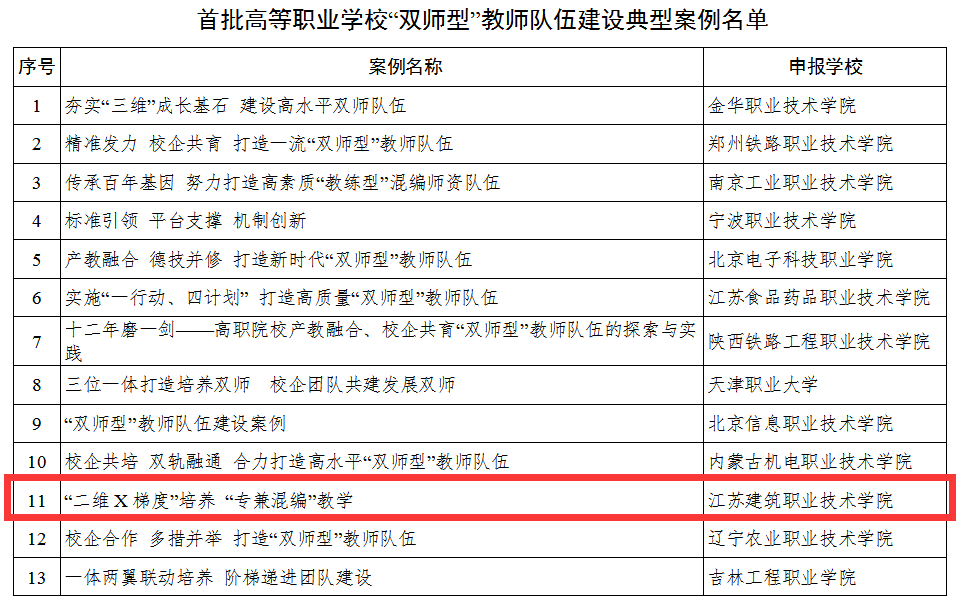 近日,教育部公布了首批全国高等职业院校“双师型”教师队伍建设典型案例名单,我校报送的《“二维X梯度”培养,“专兼混编”教学》案例成功入选。