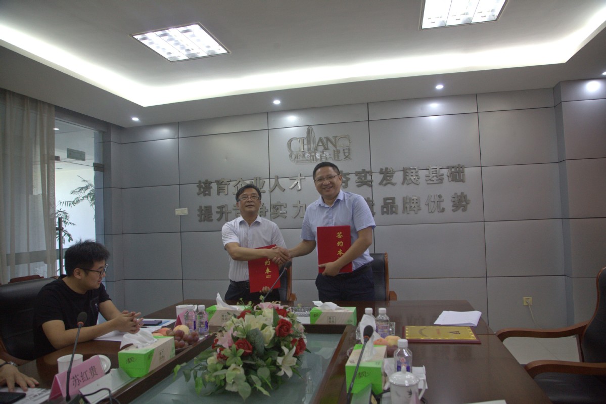 仪式上,蒋兆峰与谢福建共同签订了校企合作协议,谢福建代表常青集团向建筑管理学院授予企业人力资源培训基地牌匾。