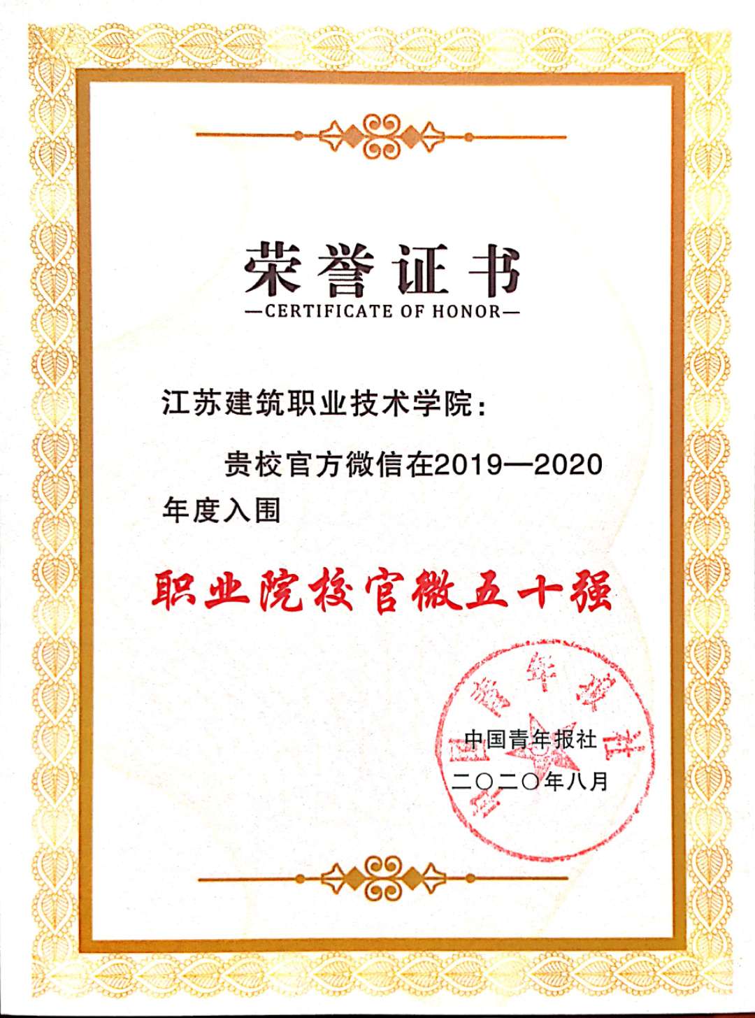 8月18-21日,由中国青年报社主办的“2020年校媒精英汇暨全国高校融媒体提升论坛”在井冈山举行,我校官微再次进入全国职业院校官微五十强,受到大会表彰。来自全国百余所高校的近200位高校新媒体相关负责人共同交流和学习高校融媒体发展经验。
