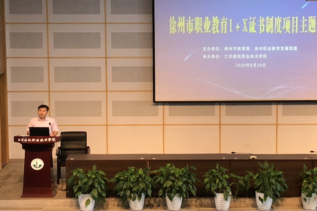 8月20日,徐州职教联盟、市教育局共同组织的职业教育“1+X”证书制度试点项目主题论坛在我校召开。徐州市教育局职教处、职成教研究室负责同志、全市27家高职院校、中职院校、企业的项目负责人和教师代表参加论坛活动。职教联盟副秘书长、实验实训管理处处长陈益武主持论坛。