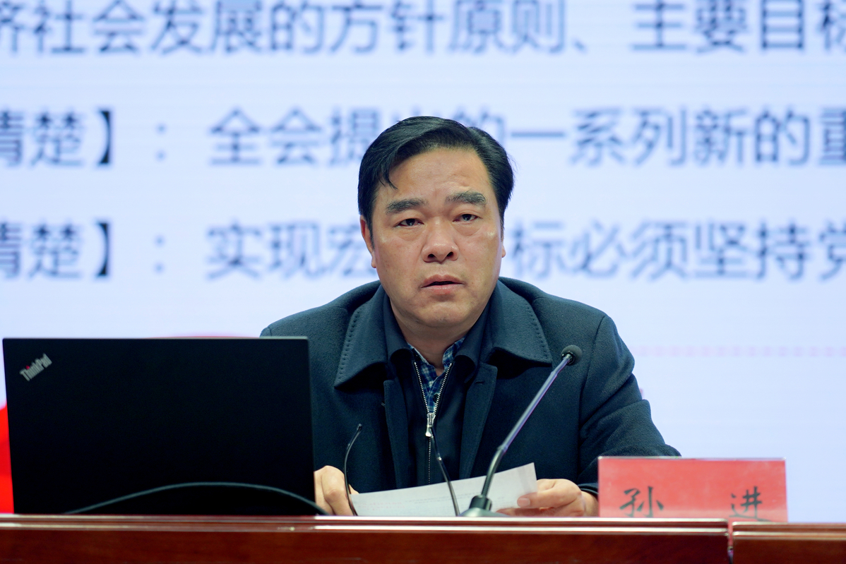 会上,孙进结合习近平总书记视察江苏时作出的重要指示,从开启新发展征程、把握新发展阶段、贯彻新发展理念、构建新发展格局、凝聚新发展合力等五个方面对党的十九届五中全会精神进行了全面系统的宣讲和深入解读。孙进提出,要充分认识十九届五中全会召开的时代背景和伟大意义,深刻领会决胜全面建成小康社会取得的决定性成就,开启新发展征程;要深刻认识进入新发展阶段的重大判断以及2035年基本实现社会主义现代化的远景目标,把握新发展阶段,以高质量发展为主题推进现代化建设;要深刻认识“十四五”时期经济社会发展的方针原则、主要目标、重点任务,贯彻新发展理念,以五大理念为主线部署“十四五”规划任务;要充分认识加快构建新发展格局的重大意义和内在必然性,深刻认识构建新发展格局的重大决策,以扩大内需为战略支点塑造新的发展与竞争优势;要深刻认识在现代化建设中必须坚持和加强党的全面领导,凝聚新发展合力,开启现代化建设新征程。