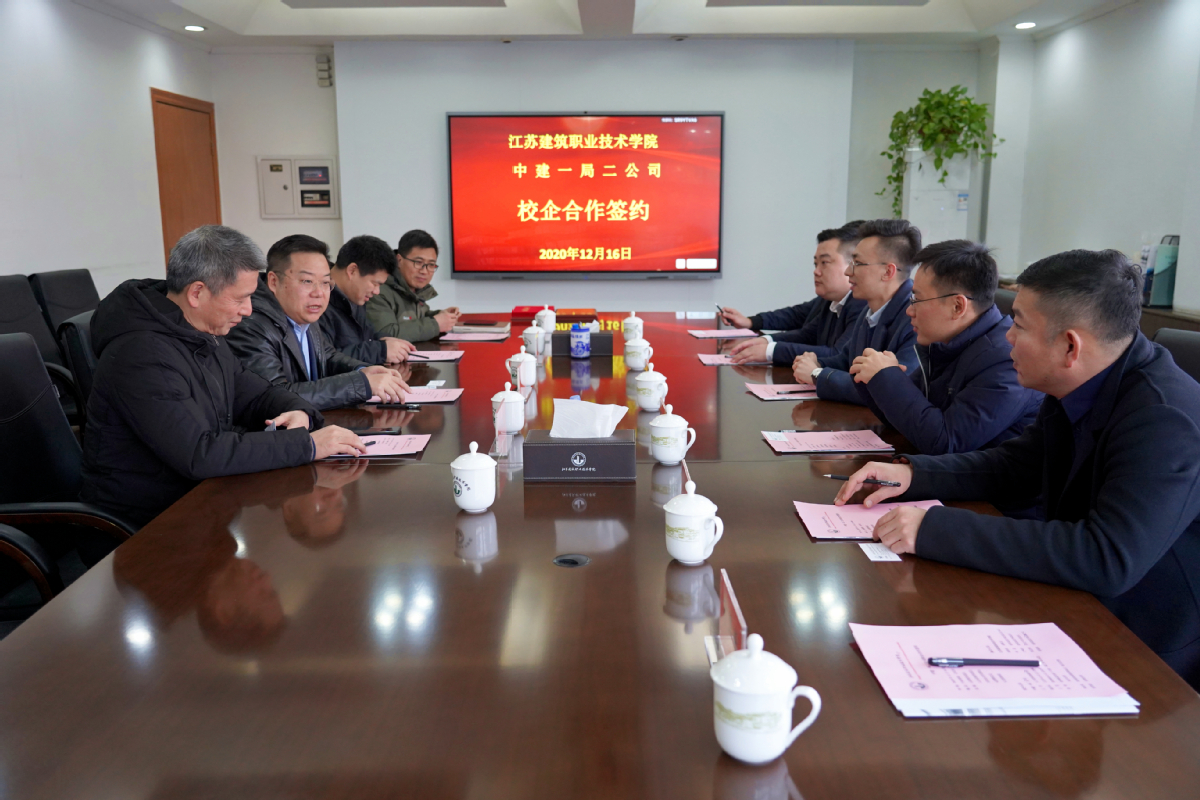 签约仪式上,刘海波介绍了我校的历史沿革、专业设置、办学特色、办学成就和未来发展规划。他指出,产教融合、校企合作是职业教育办学的基本理念,也是学校提升人才培养质量的有效路径,更是企业获得高质量技术技能人才的有效方式。刘海波表示,中建一局二公司有着优良的文化传统、严谨的管理制度、较高的社会美誉度和为建筑行业赋能育人的社会担当,江苏建院愿意与中建一局二公司深化合作,培育人才。王洋全面介绍了中建一局二公司的发展历史、业务的国际国内布局、人才梯队建设规划、校企合作需求以及在徐的典型工程项目。