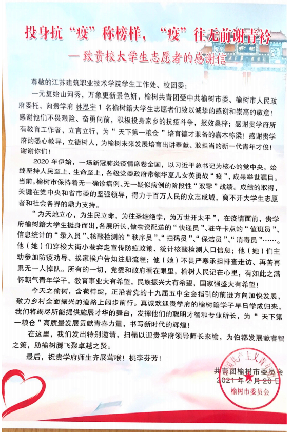 近日,我校智能制造学院收到共青团吉林省榆树市委发来的一封题为《投身抗“疫”称榜样,“疫”往无前谢青衿》的感谢信。信中对机制20-1班林思宇同学不畏艰险、奋勇向前,积极投身家乡的抗疫斗争表达了诚挚的感谢和崇高的敬意。