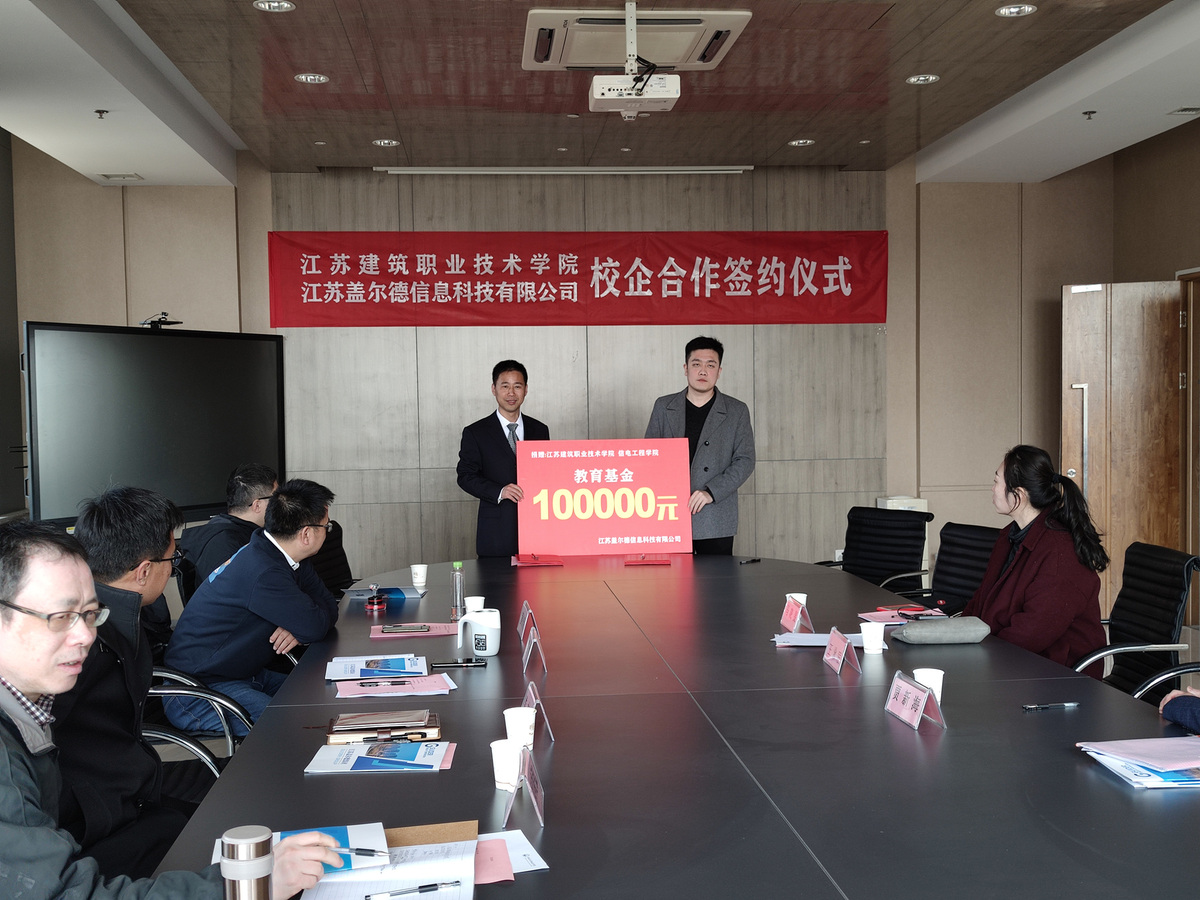 签约仪式上,王泳辰介绍了盖尔德的历史、现状以及将来发展目标,也感谢我校往届毕业生给公司创造的价值,并把我校作为公司合作的第一家高校。校企合作处处长娄志刚介绍了我校的办学历史、办学特色以及校企合作政策。信电工程学院院长吴兆立介绍了学院的办学规模、专任教师和专业发展等基本情况。双方就现代学徒制人才培养模式、人才培养方案开发实施和信息技术应用等方面进行了详细交流与深入探讨。同时,江苏盖尔德信息科技有限公司向我校捐助了首笔教育基金。