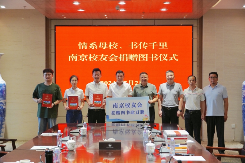 仪式上,蒋兆峰代表学校接受捐赠并为南京校友会颁发捐赠牌匾和证书。南京校友会副会长张盖代表南京校友会参加了捐赠仪式,并亲自将4万册图书送至学校。