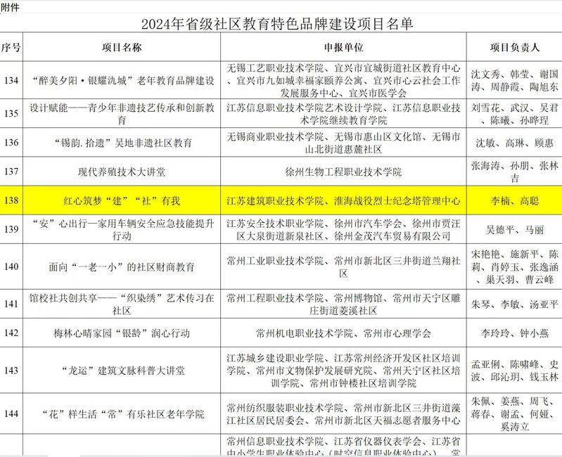 近日,我校重点建设的社区教育项目《红心筑梦“建”“社”有我》入选2024年度省级社区教育特色品牌建设项目。该项目由我校艺术设计学院教师李楠牵头负责,联合淮海战役烈士纪念塔管理中心共建。