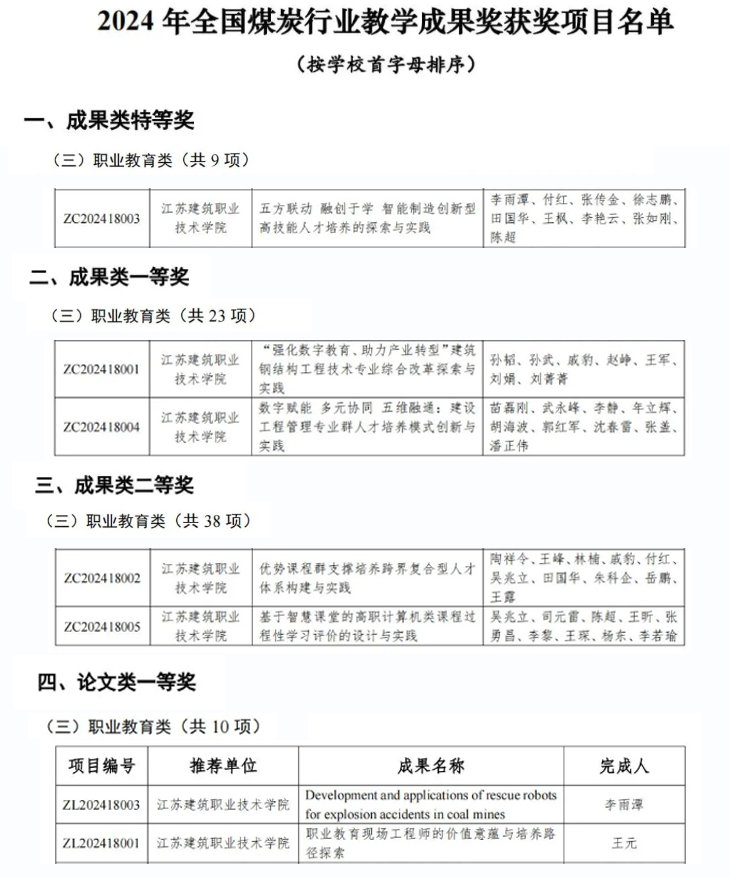近日,中国煤炭教育协会公布了2024年度全国煤炭行业教学成果奖,我校获成果类特等奖1项,一等奖2项,二等奖2项,论文类一等奖2项。获奖等次和数量均创历史新高。